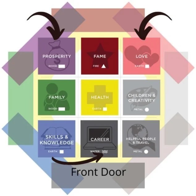 Quick Feng Shui 101: Everything in your life can be put into 1 of 9 life categories. Each of these categories is represented spatially in your home. See graphic for details.